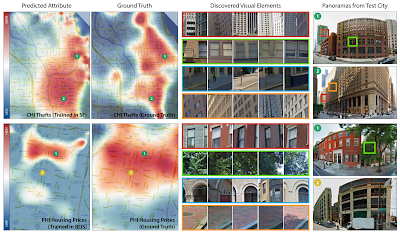 The City Forensics paper from Berkeley tries to map the visual appearance of cities (as obtained from Google Street View Images) to non-visual data like crime statistics, housing prices and population density. The basic idea is to 1.) mine discriminative patches from images and 2.) train a predictor which can map these visual primitives to non-visual data. While the underlying technique is that of mid-level patch discovery combined with Support Vector Regression (SVR), the result is an attribute-specific distribution over GPS coordinates. Such a distribution should be appreciated for its own aesthetic value. I personally love custom data overlays.